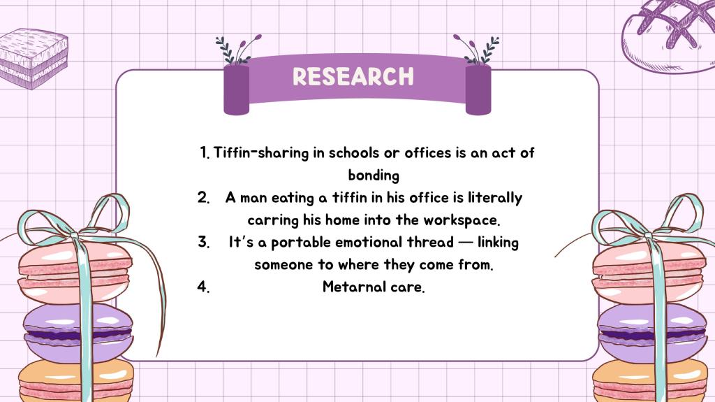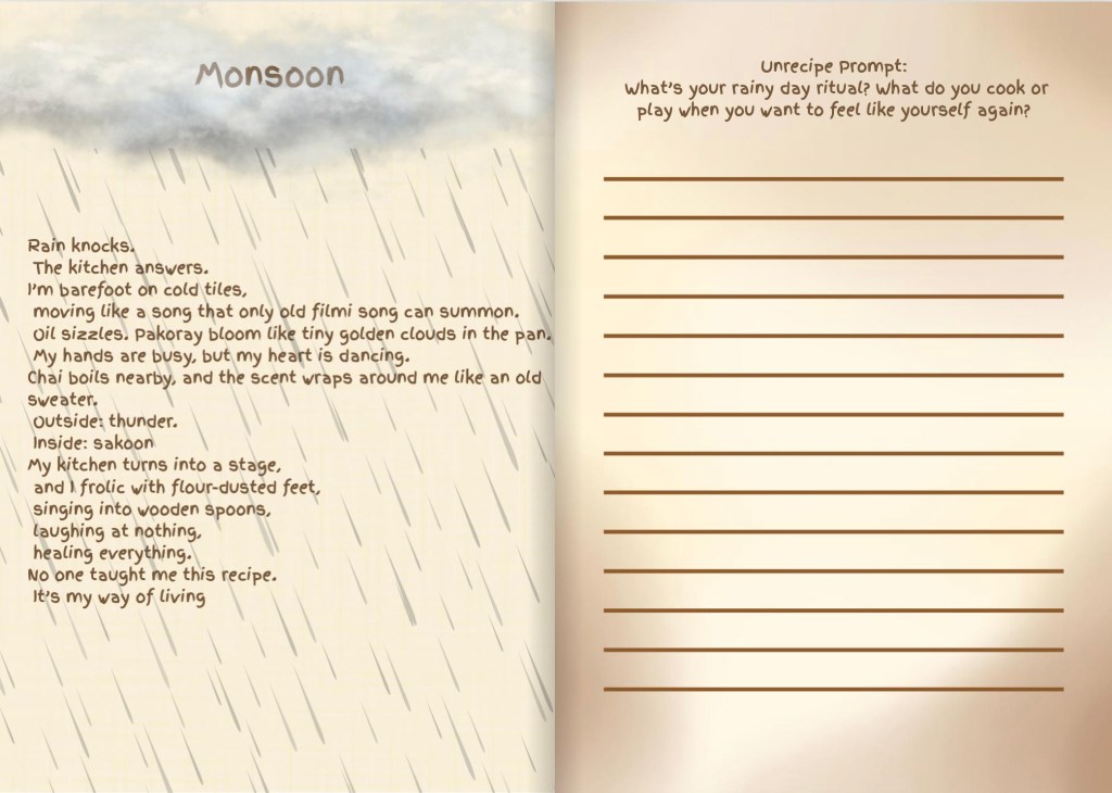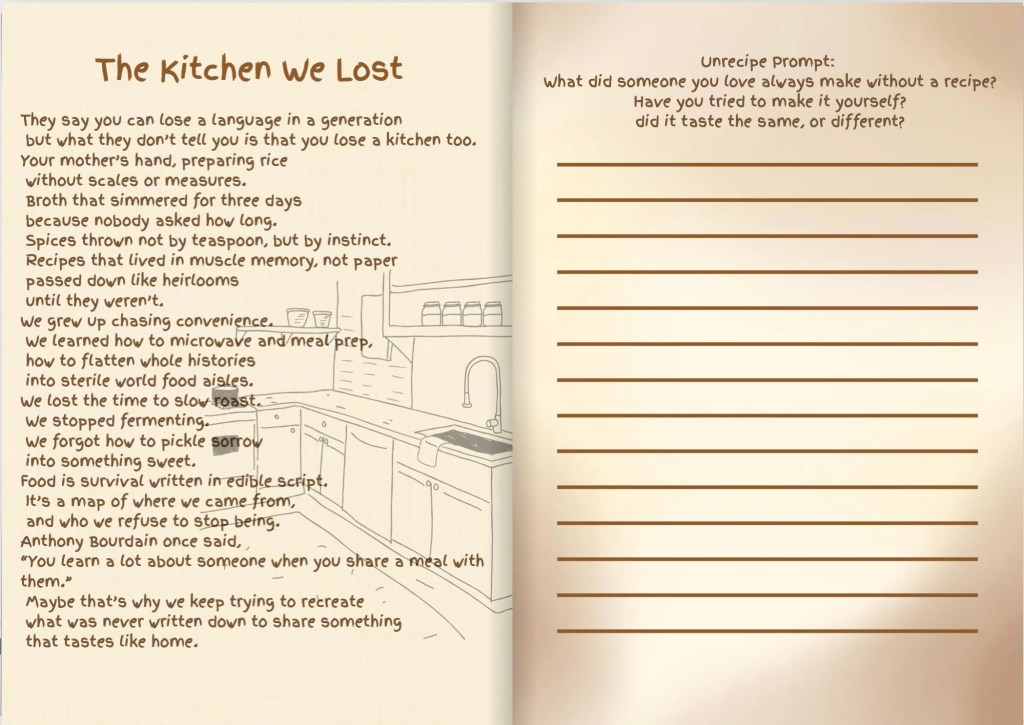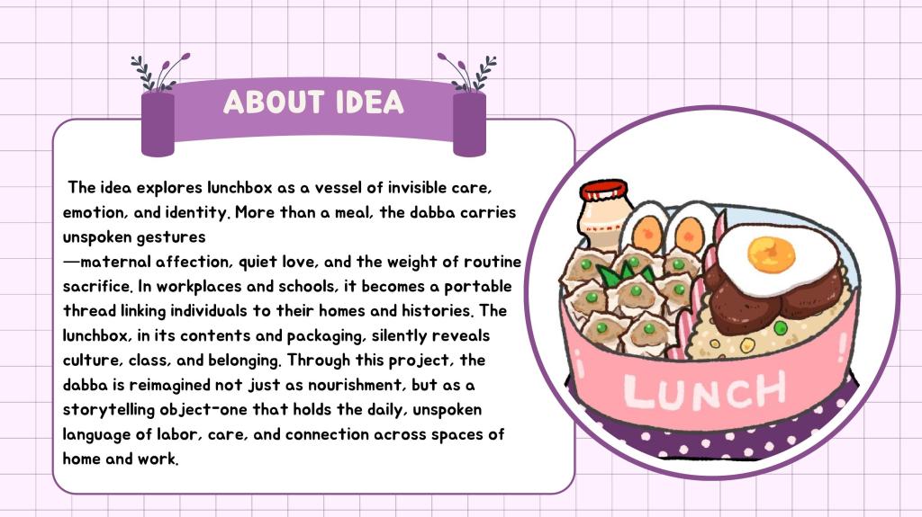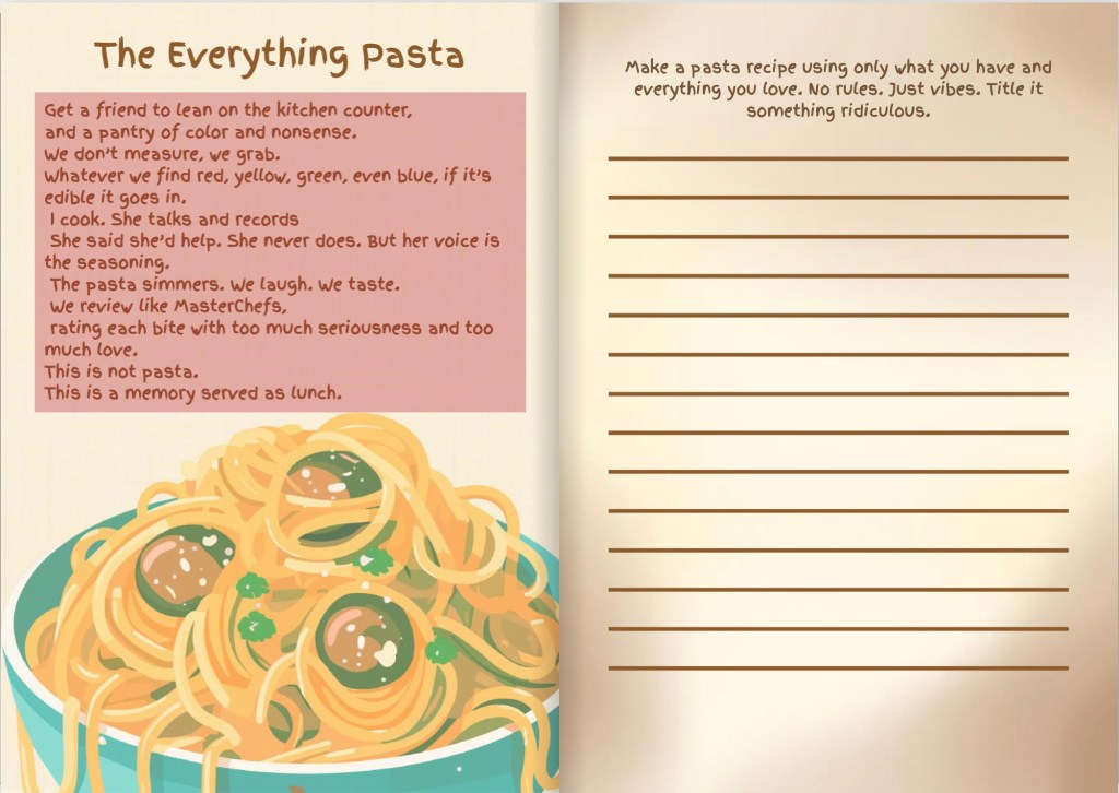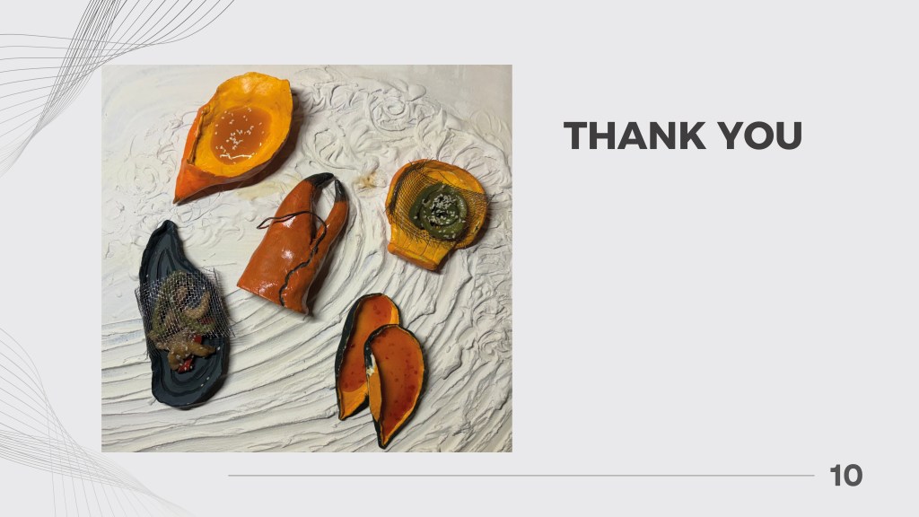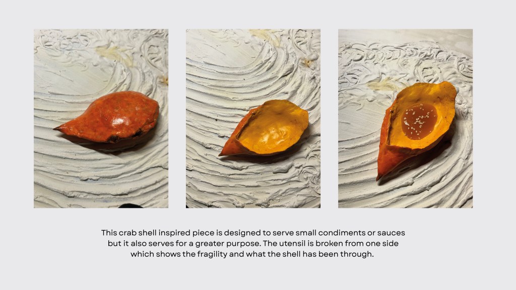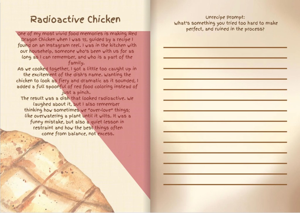 The final project, titled “Chef’s Special,” invited students to develop an independent, research-based work that reflected their personal interests and the themes explored throughout the course. Much like a chef crafting a signature dish through skill, experimentation, and personal touch, students were encouraged to pursue a concept that felt meaningful or urgent to them, whether connected to food and memory, identity, ritual, material culture, storytelling, or social critique. The process began with identifying a research interest and completing a proposal worksheet outlining their intent, approach, and intended outcome. Students then conducted in-depth research using academic texts, interviews, case studies, fieldwork, or material exploration, while simultaneously planning the execution of their work. The final outcome took various forms—visual, performative, textual, spatial, or mixed-media—depending on what best suited each concept.