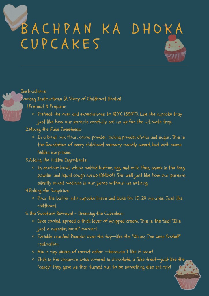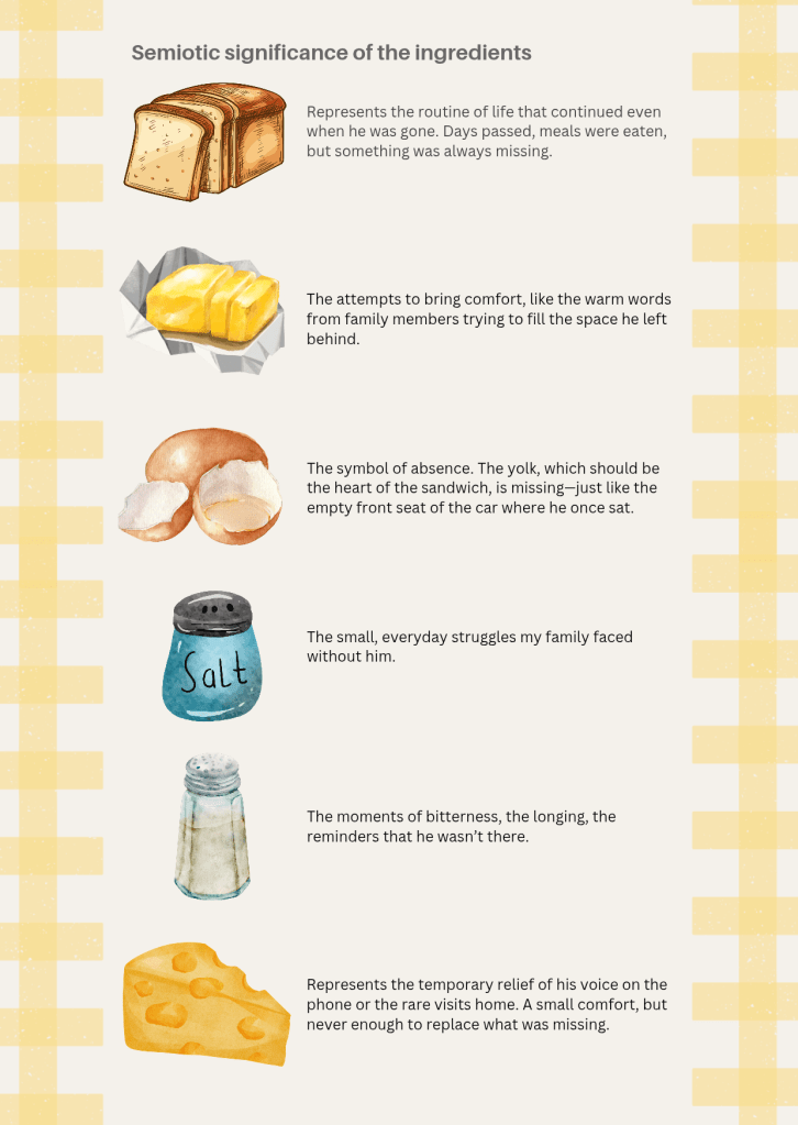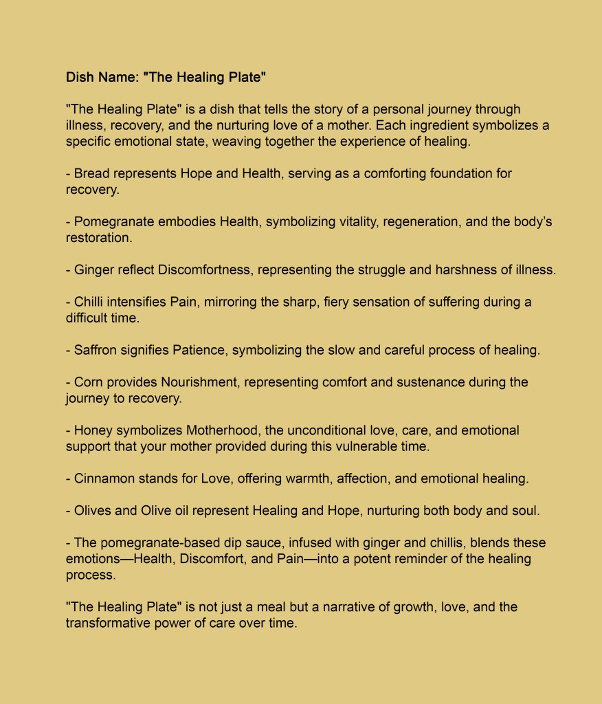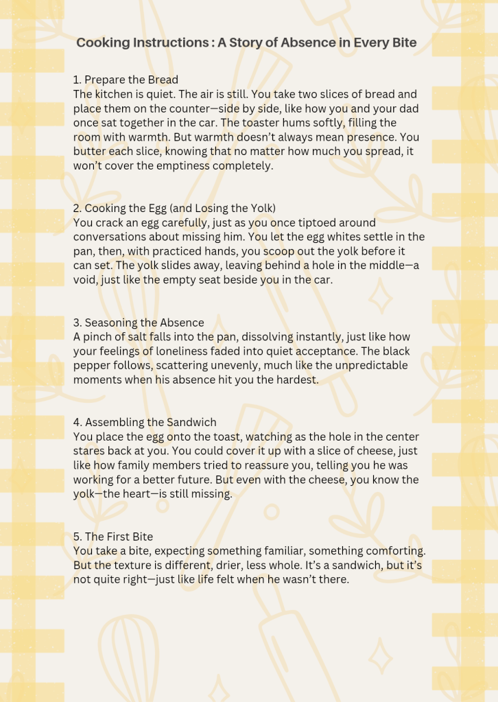 Each student developed a recipe that was both literal and symbolic. They listed ingredients with precise measurements and preparation methods, but more importantly, they explained the symbolic weight of each ingredient. These ingredients served as metaphors, connecting the act of cooking to the layers of personal meaning and cultural background behind the memory. The cooking instructions were often written as narratives, blending steps of the recipe with storytelling. Students were encouraged to be poetic, reflective, or conversational—bringing their memories to life through the process of preparing the dish. This blending of culinary method with emotional depth turned a typical recipe format into a form of autobiographical expression.