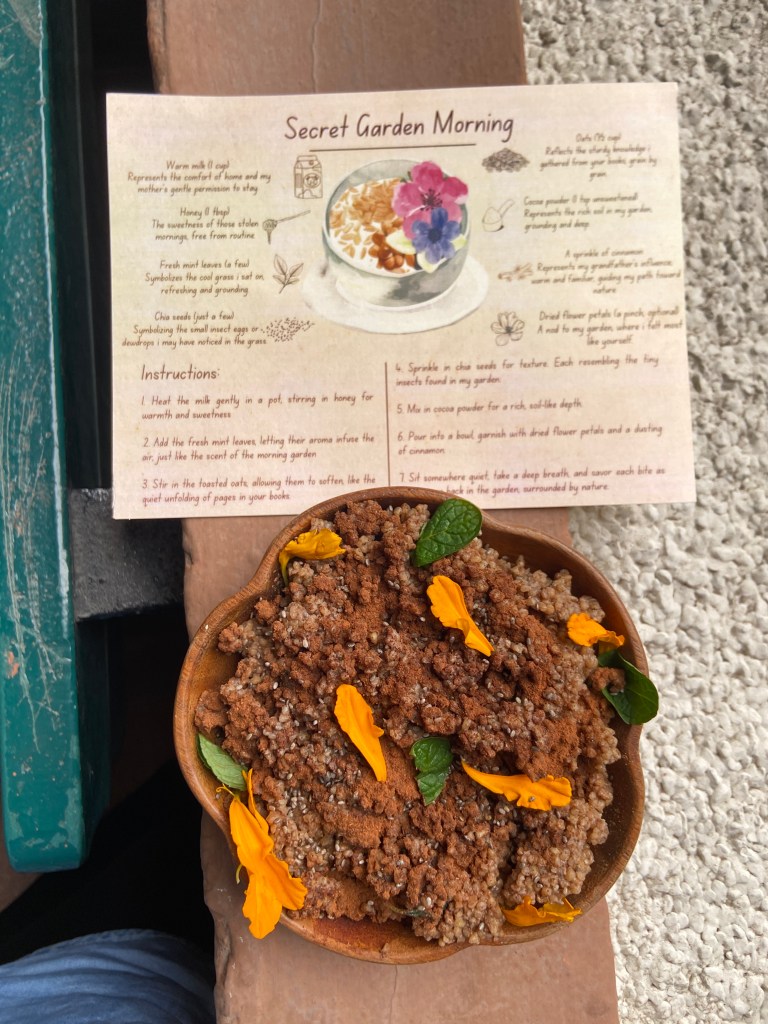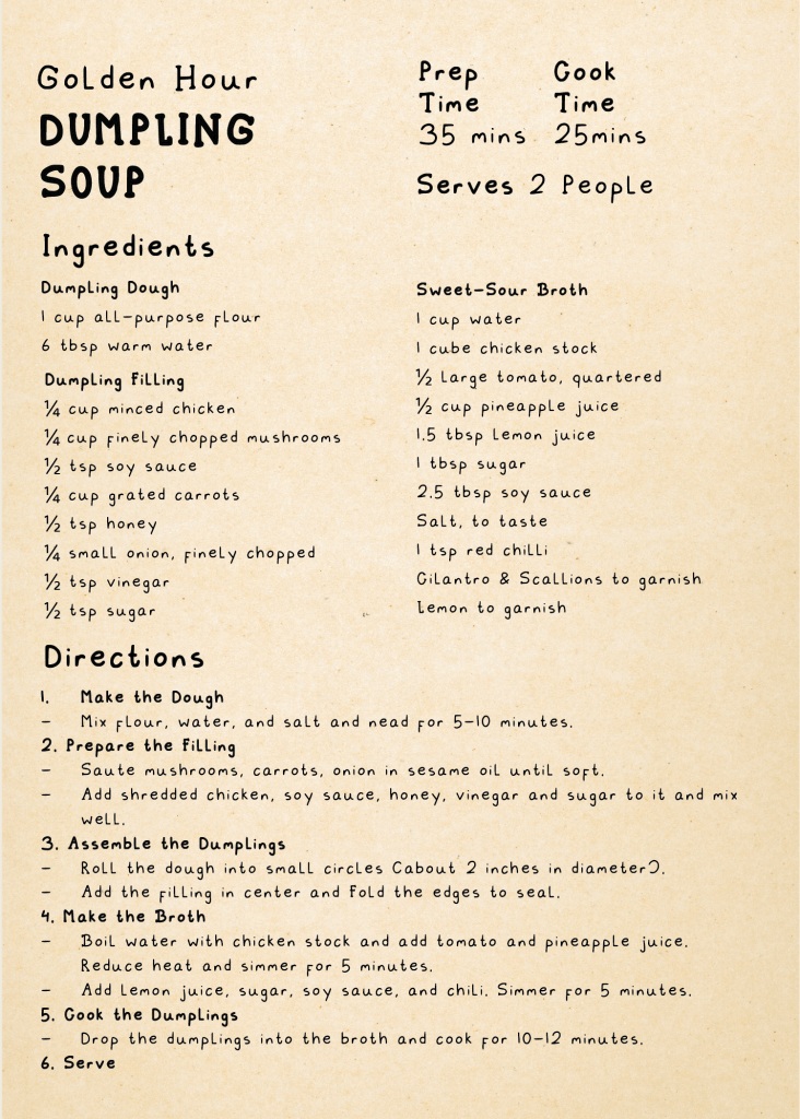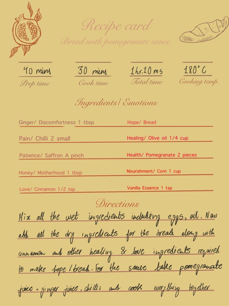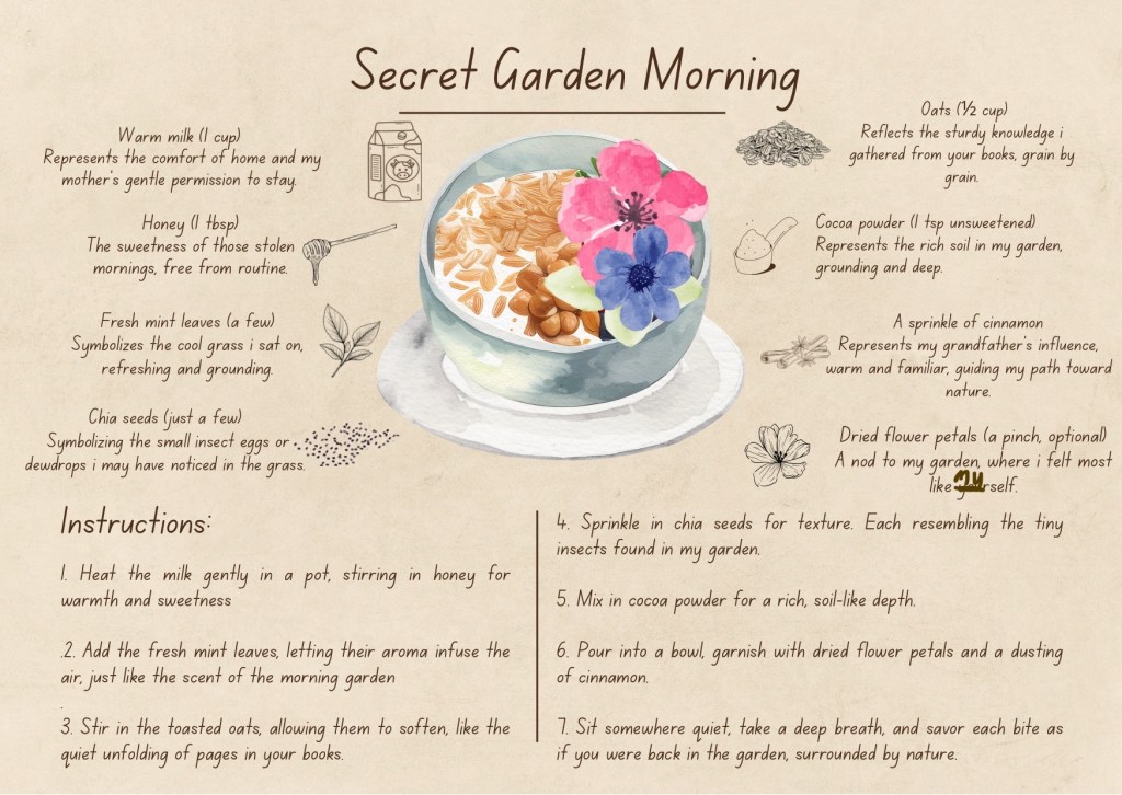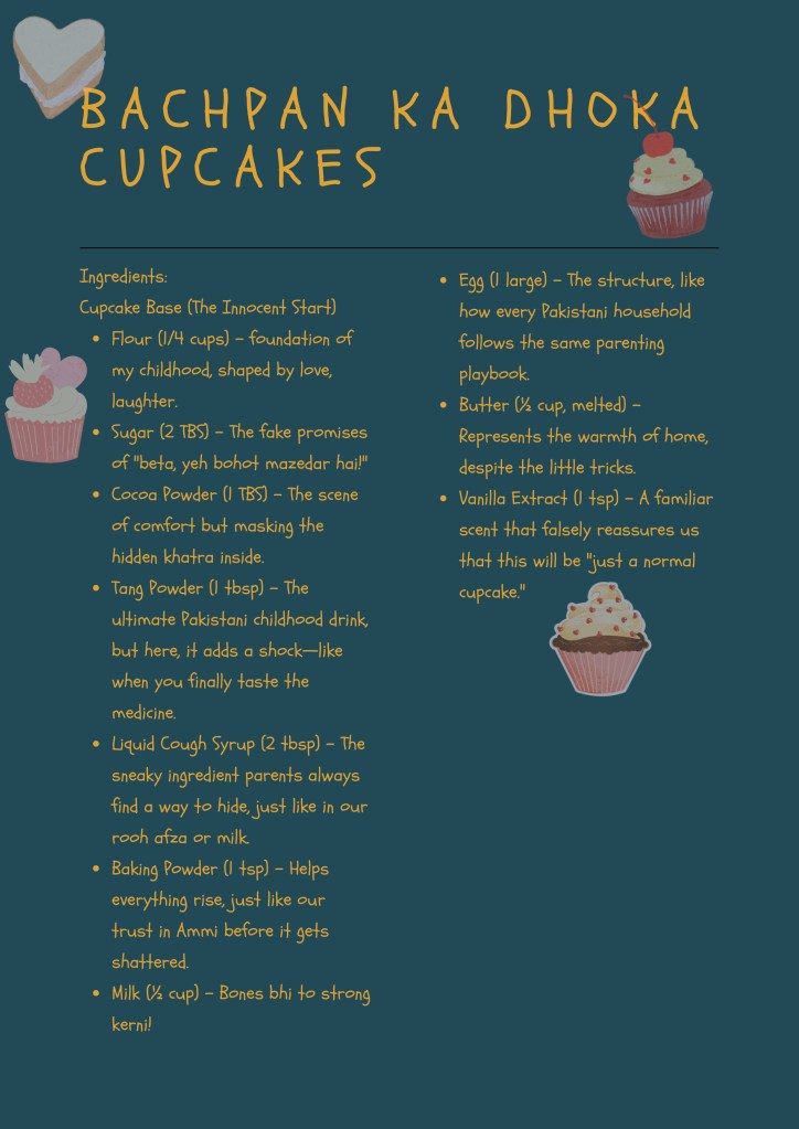 Each student developed a recipe that was both literal and symbolic. They listed ingredients with precise measurements and preparation methods, but more importantly, they explained the symbolic weight of each ingredient. These ingredients served as metaphors, connecting the act of cooking to the layers of personal meaning and cultural background behind the memory. The cooking instructions were often written as narratives, blending steps of the recipe with storytelling. Students were encouraged to be poetic, reflective, or conversational—bringing their memories to life through the process of preparing the dish. This blending of culinary method with emotional depth turned a typical recipe format into a form of autobiographical expression.