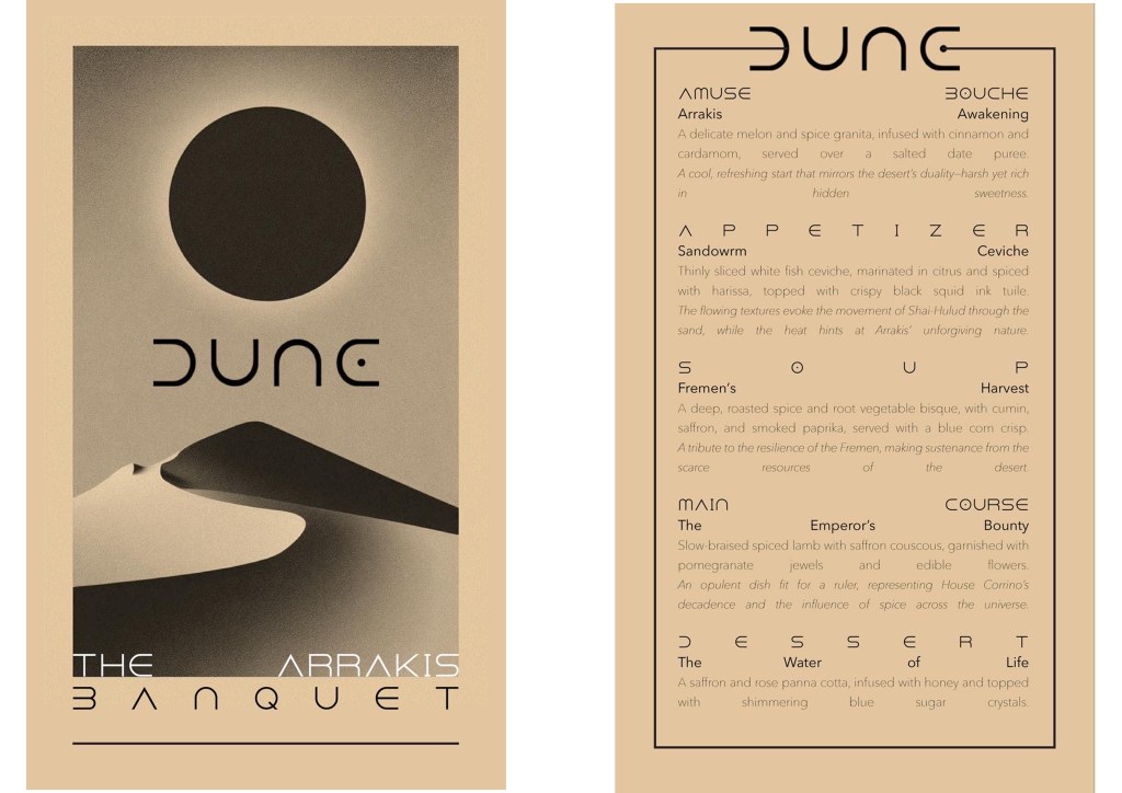 In this assignment, students designed a five-course menu inspired by a film of their choice, using food as a storytelling medium. Each course—Amuse-Bouche, Appetiser, Main Course, Dessert, and After-Dinner Drink—symbolically represented a character, theme, or pivotal moment from the film. Students selected emotionally or thematically rich films and translated their essence into thoughtfully conceptualized dishes. Brief written explanations accompanied each course, highlighting its narrative connection. The final menu was visually presented in a format that aligned with the film’s aesthetic, blending culinary creativity with cinematic analysis.