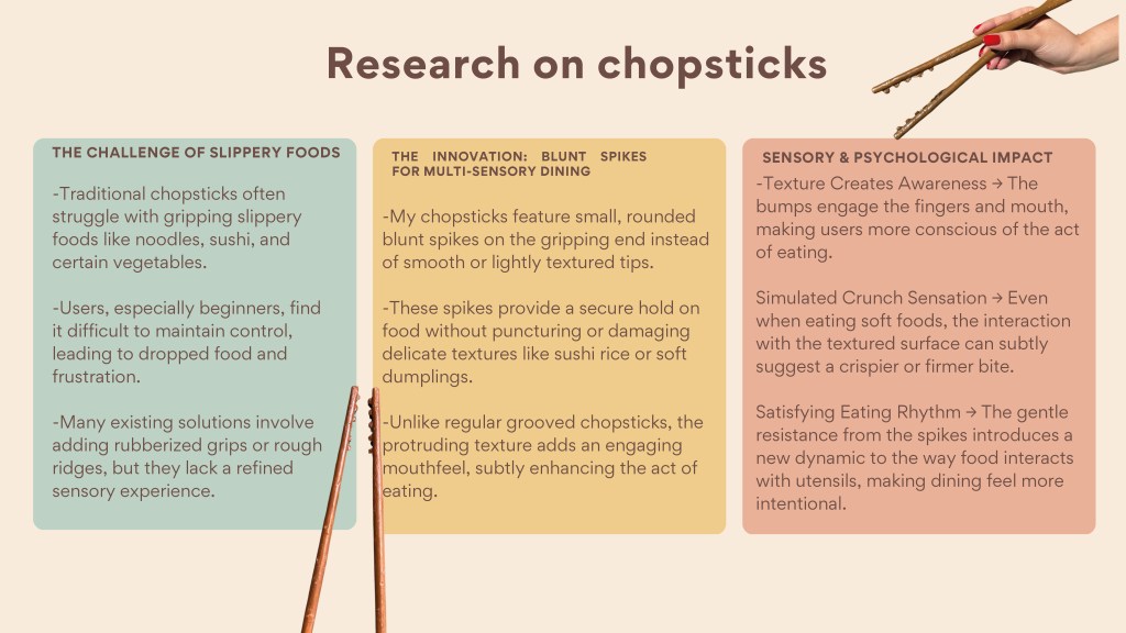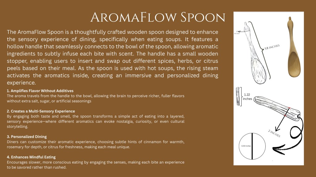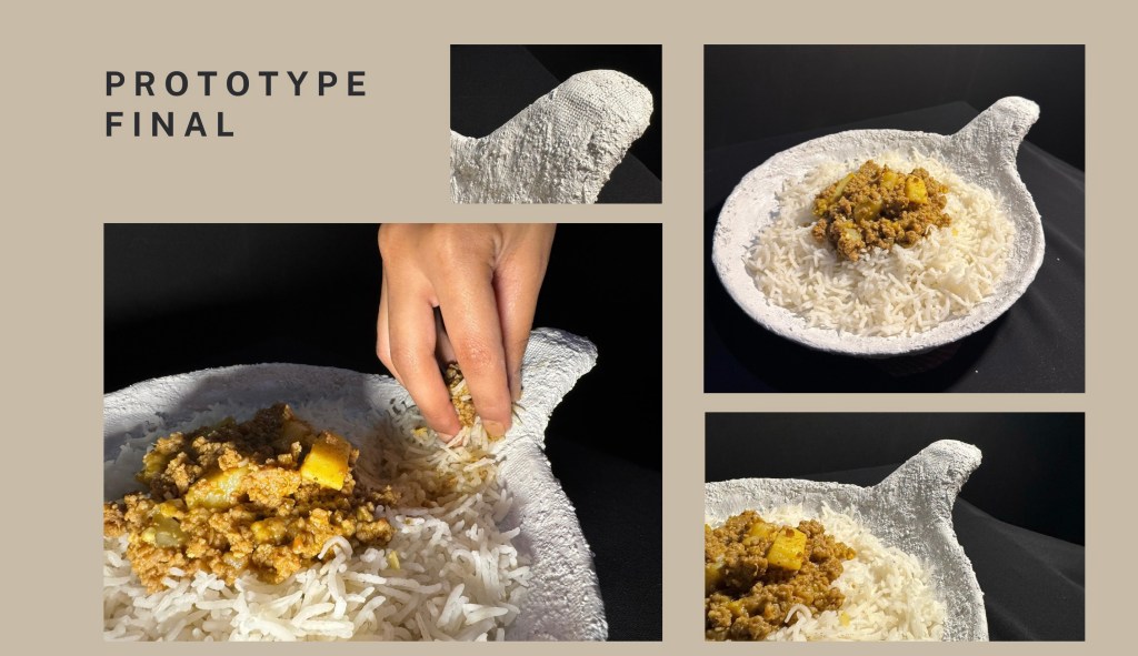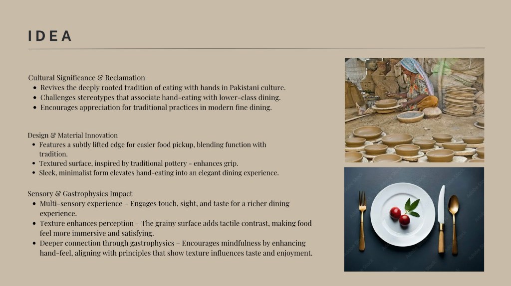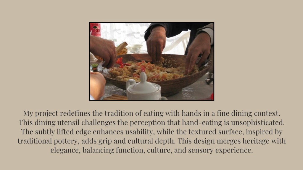 In this assignment, students were tasked with designing and creating an innovative dining product—such as cutlery, crockery, or a tool that enhances the eating experience. The goal was to propose a meaningful innovation in the way we eat, informed by insights from the Gastrophysics lecture. Emphasis was placed on exploring how aspects like shape, texture, form, function, and color can influence the sensory and psychological experience of dining. Through this project, students applied gastrophysics principles while developing their skills in ideation, sketching, prototyping, and presentation. Each student submitted a functional prototype and a detailed process PDF. The PDF included a title and concept statement outlining the idea and its contribution to the dining experience, inspiration and research drawn from gastrophysics and other relevant sources, initial sketches and ideation work, process documentation including material exploration and challenges, and final visuals of the completed product with a description of its features. The final evaluation was based on innovation and creativity, application of gastrophysics, thoroughness of process documentation, craftsmanship, and overall presentation.