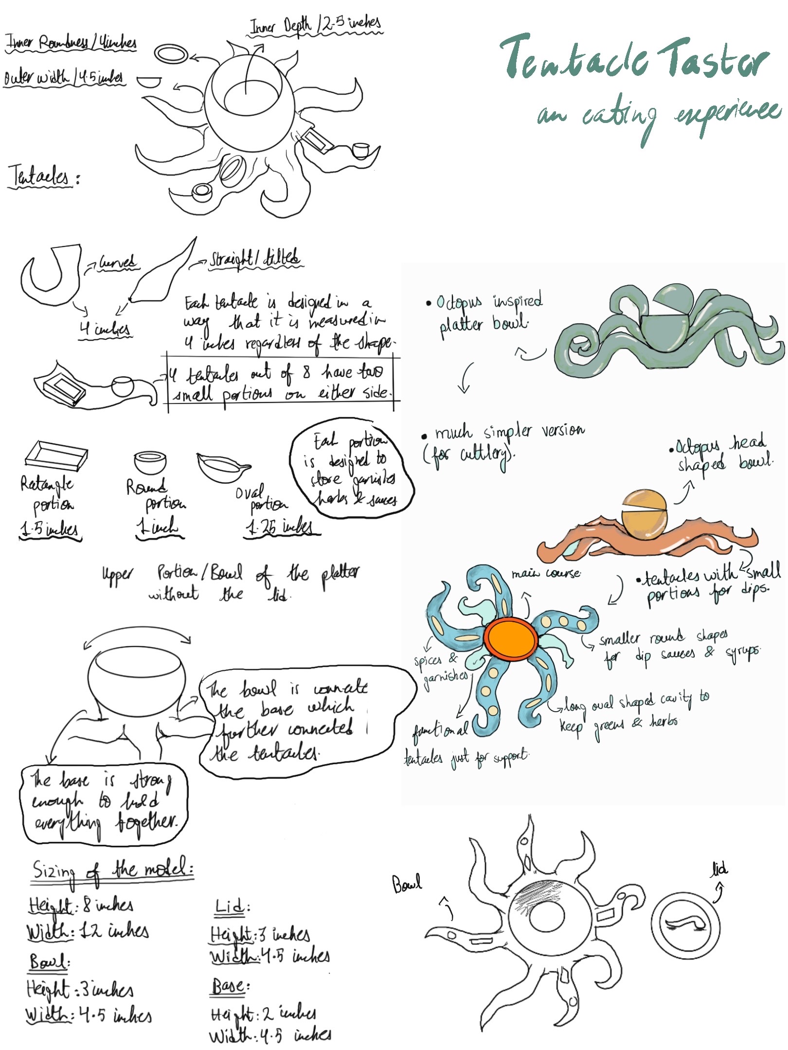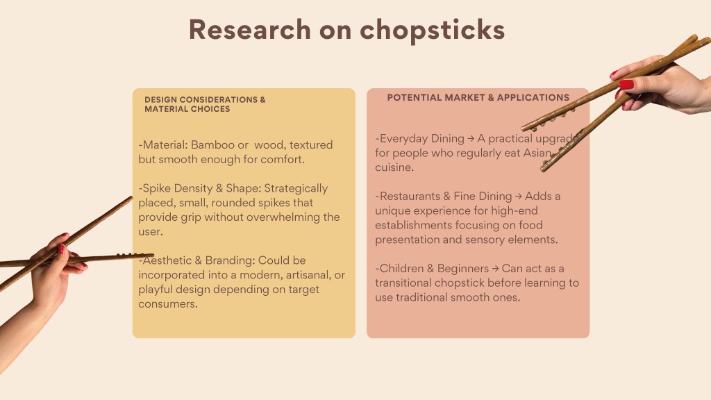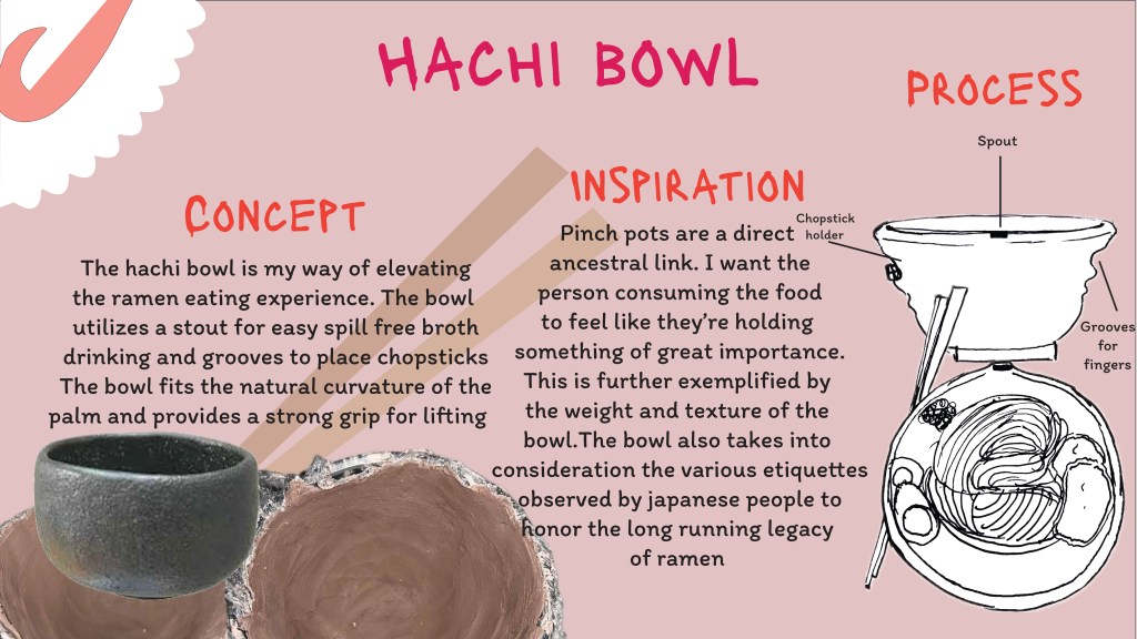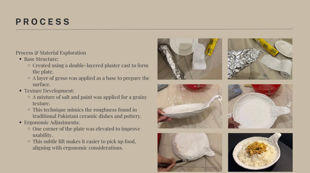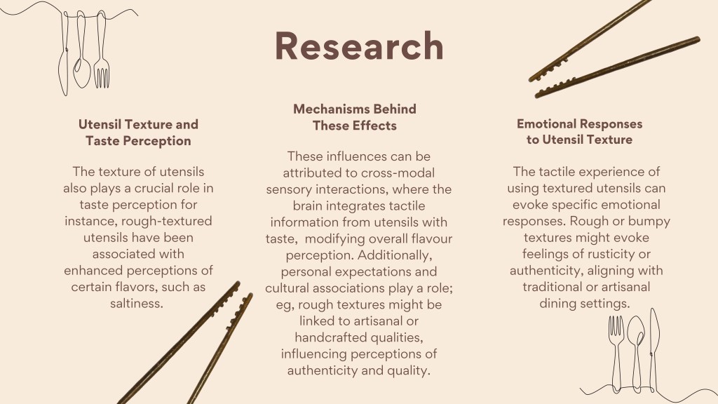 In this assignment, students were tasked with designing and creating an innovative dining product—such as cutlery, crockery, or a tool that enhances the eating experience. The goal was to propose a meaningful innovation in the way we eat, informed by insights from the Gastrophysics lecture. Emphasis was placed on exploring how aspects like shape, texture, form, function, and color can influence the sensory and psychological experience of dining. Through this project, students applied gastrophysics principles while developing their skills in ideation, sketching, prototyping, and presentation. Each student submitted a functional prototype and a detailed process PDF. The PDF included a title and concept statement outlining the idea and its contribution to the dining experience, inspiration and research drawn from gastrophysics and other relevant sources, initial sketches and ideation work, process documentation including material exploration and challenges, and final visuals of the completed product with a description of its features. The final evaluation was based on innovation and creativity, application of gastrophysics, thoroughness of process documentation, craftsmanship, and overall presentation.