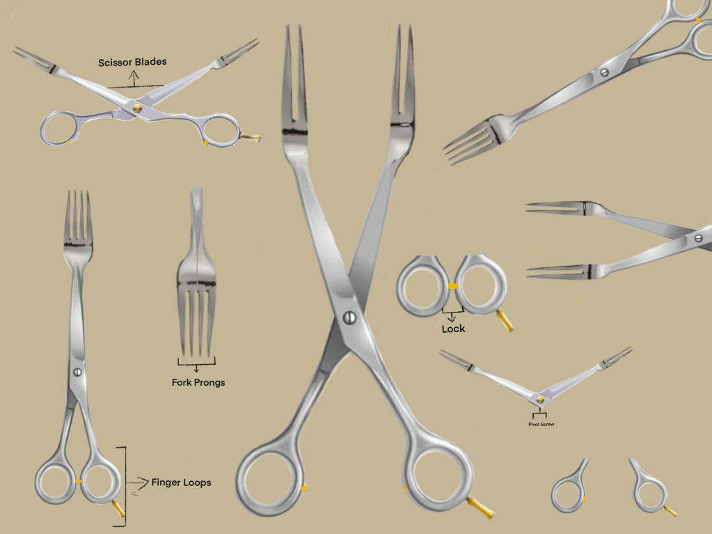 The Scissor-Fork Hybrid is a multifunctional tool that combines the functions of scissors and a fork in one seamless design. When open, it works like a regular pair of scissors for cutting, and when closed, the pronged tips align to form a fully functional fork. A small locking mechanism in the handle ensures stability when used as a fork, making it easy and safe to handle. This innovative design is ideal for people who need both tools in daily life, whether in the kitchen, outdoor dining, or multitasking situations. It enhances convenience, saves space, and offers a unique blend of practicality and efficiency.