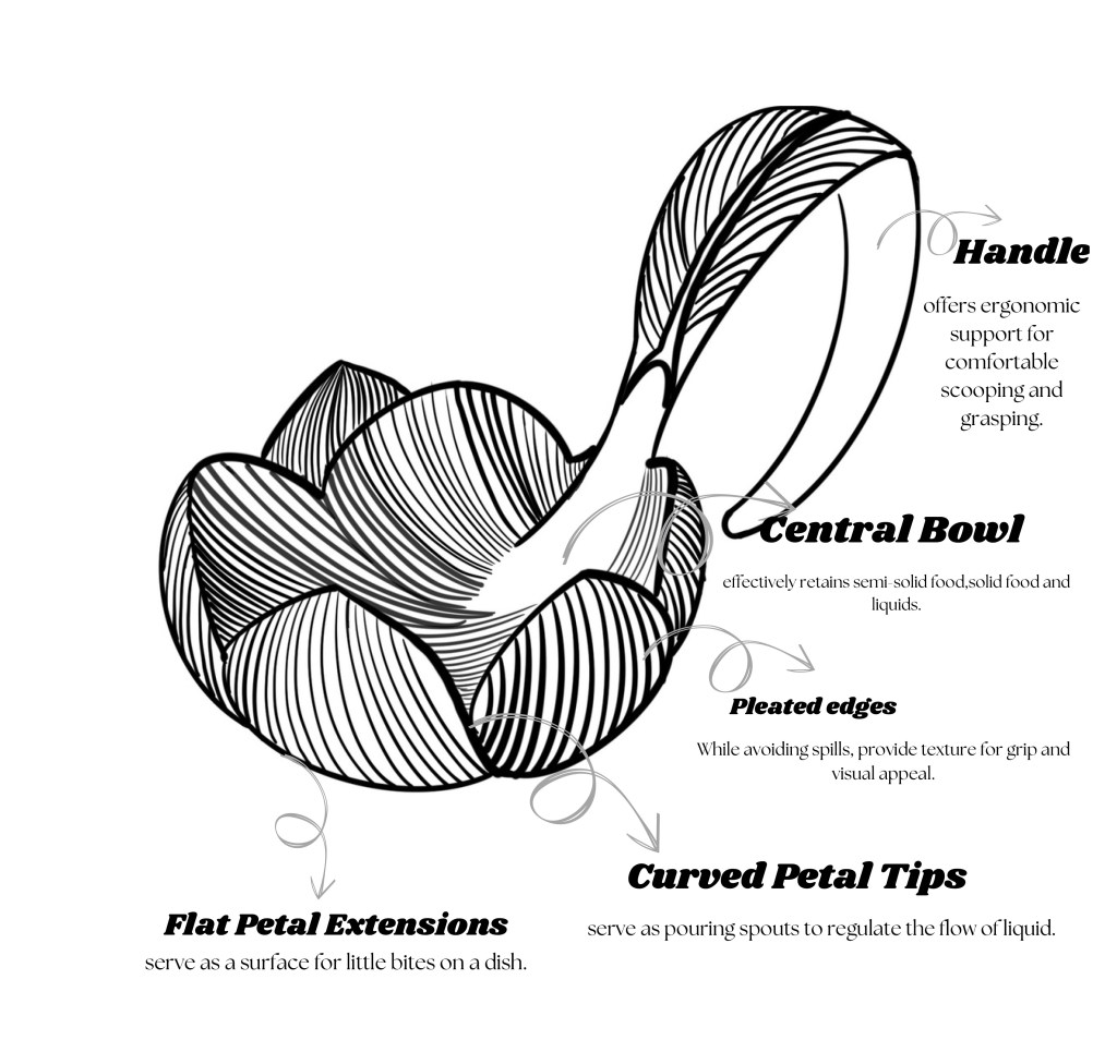 Inspired by the beauty of the lotus blossom, this creative multipurpose dining item skilfully combines style and functionality. Its petal-shaped parts act as both a spoon and a bowl, creating a sculptural form that elevates the dining experience. The pleated texture provides both practical grip and rigidity in addition to a visually arresting design that resembles the delicate folds of a lotus flower. This item represents the balance of nature and functionality and is more than just dinnerware. Serving and enjoying food is elevated by its organic yet elegant shape, whether it is utilised for gourmet amuse-bouche, broths, or modern dinner settings. It combines innovation and tradition, bringing together the aesthetic appeal of nature with practical efficiency, making it ideal for contemporary culinary presentations.