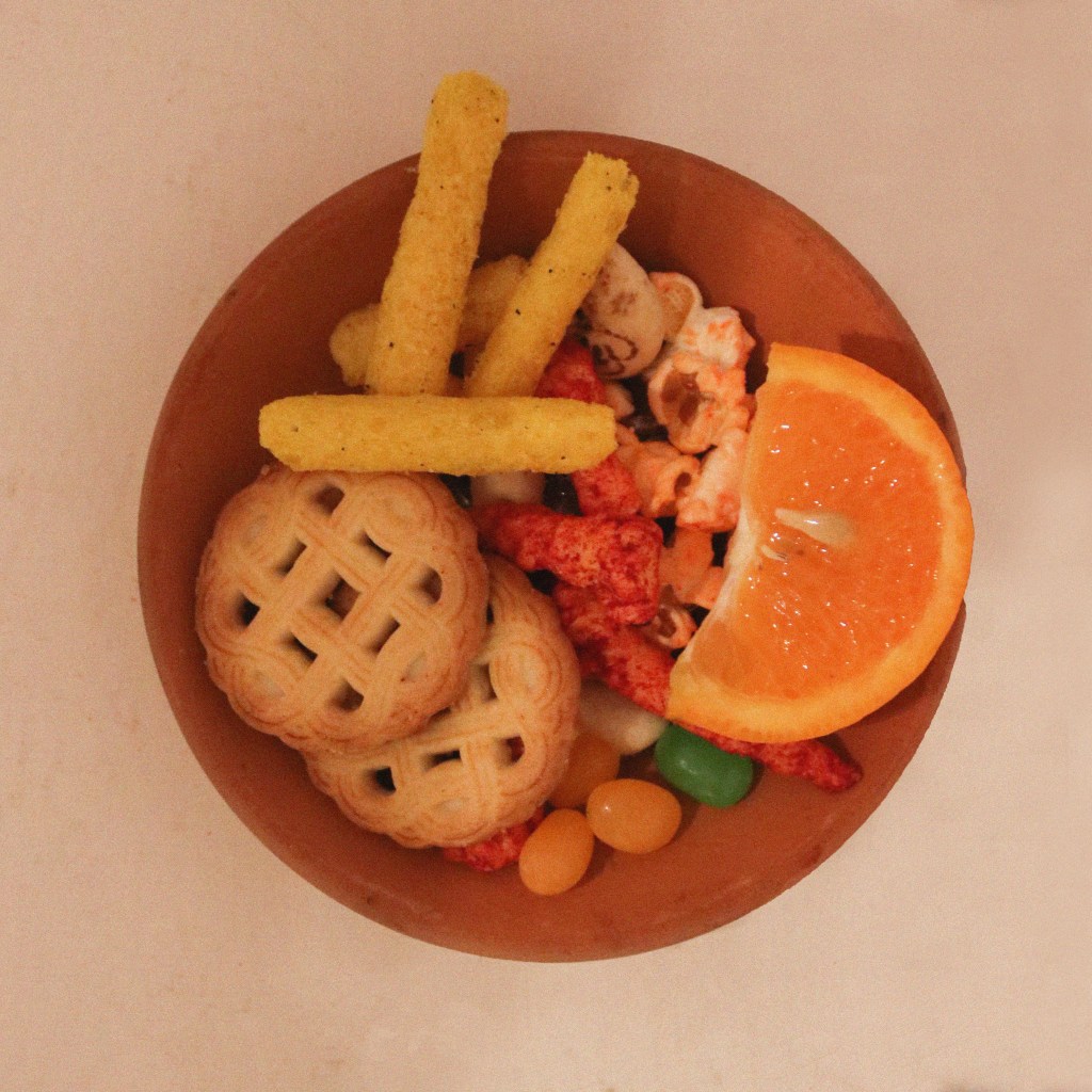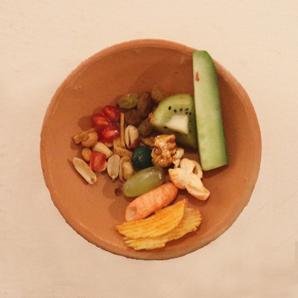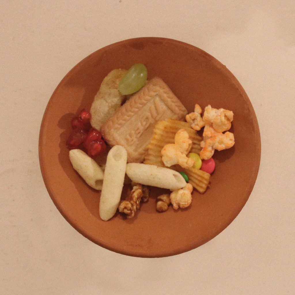 Food holds the power to evoke emotions, take us to the particular time that we have experienced, direct our mind towards certain people we have shared a particular dish with—a single bite ignites vivid memories, conjuring cherished moments and familiar faces. Remnants of a Loved One is an ongoing project in which the artists aims to collect visuals of plates curated by people from the selection of 60 food items ranging from the local snacks, to the fruits and vegetables that are frequently used in the region; the food items in the spread are chosen keeping the local context in mind. The participatory installation gives the participant a prompt to interact with the work. The instructions include picking up an empty plate and then picking out food items from the table that reminds them of a particular loved one. The artist looks at these curated plates as portraits of people’s loved one.