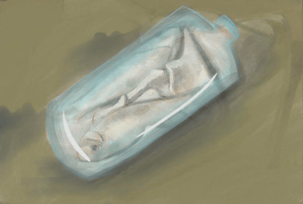 To reimagine Red Mullets today means addressing pressing contemporary concerns—especially environmental degradation and overconsumption. While Monet celebrated the natural beauty of marine life, today’s oceans face pollution, overfishing, and the consequences of climate change. In my reinterpretation, the once vibrant fish become transparent forms, marked with traces of pollutants to reflect the contaminated state of modern marine ecosystems. Instead of the clean coastal setting of Étretat, the fish would be placed in a polluted harbour—surrounded by murky water, oil slicks, and industrial waste. The shift in palette from vibrant to dull tones would communicate loss: of beauty, of health, and of balance. This reimagined work becomes a call to action—a reflection on how consumer culture and the global food industry have contributed to ecological damage. Through this adaptation, Monet’s legacy is preserved but transformed into a powerful commentary on sustainability and environmental responsibility in today’s world.