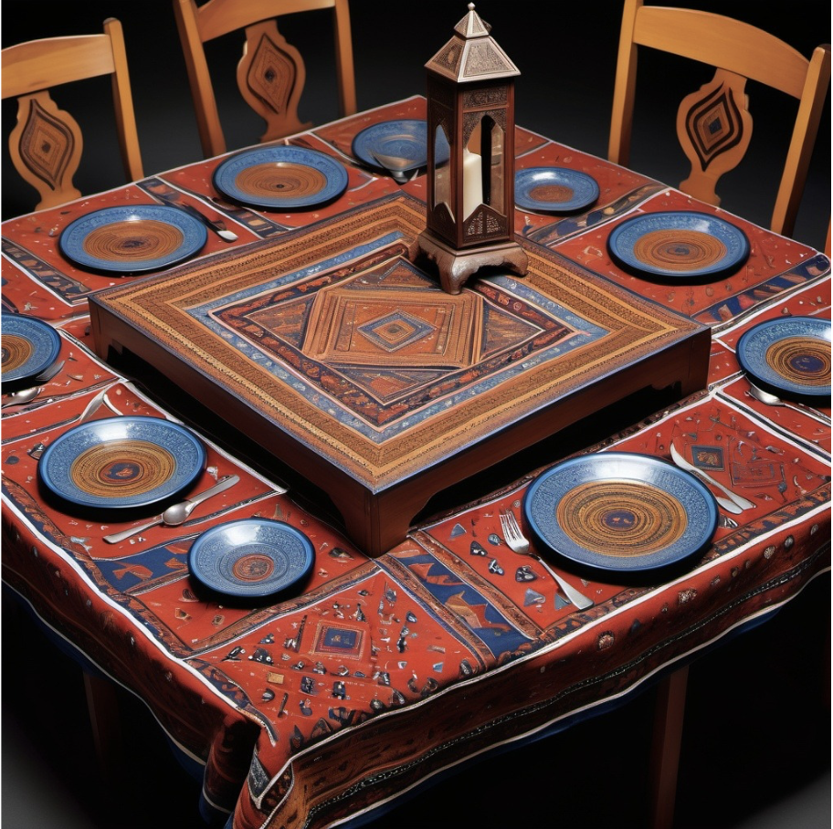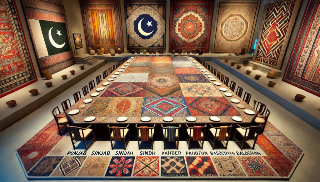 The reimagined version of The Dinner Party celebrates the contributions of women in Pakistan’s rich cultural and historical landscape. Designed as a four-sided table representing the country’s provinces—Punjab, Sindh, Khyber Pakhtunkhwa, and Balochistan—it symbolizes national unity and shared female experiences. Each side features traditional crafts such as phulkari, ajrak, mirror work, Pashtun embroidery, and Balochi needlework. The base honors countless overlooked Pakistani women, including freedom fighters, activists, minorities, and rural voices. Incorporating interactive QR codes and using sustainable materials like recycled textiles and local clay, this adaptation bridges feminism with environmental awareness while preserving cultural identity.