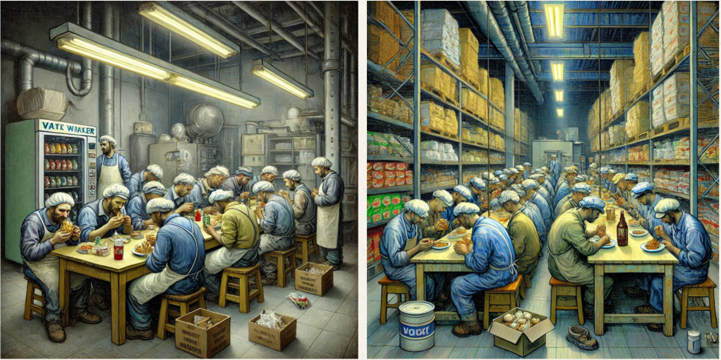 This contemporary reinterpretation of Vincent van Gogh’s The Potato Eaters shifts the scene from a rural home to a supermarket break room or food processing facility, highlighting the struggles of modern food industry workers. Surrounded by shelves of mass-produced goods they can’t afford, under harsh fluorescent lighting, workers eat cheap, unappetizing meals—revealing the stark irony of food insecurity within a sector that feeds millions. The sterile, industrial setting contrasts with the warmth of van Gogh’s original, emphasizing how technology and capitalism have stripped food of its communal and emotional value. This version critiques economic inequality, labour exploitation, and the environmental and social costs of industrialised food systems.