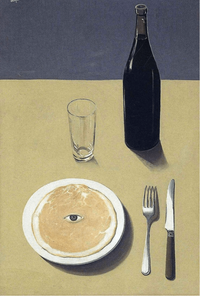 Rene Magritte’s The Portrait (1935) is a compelling example of surrealist art that uses food to explore perception, the uncanny, and the subconscious. By placing a human eye in the center of a slice of meat on a dinner plate, Magritte disrupts the familiar, turning a mundane meal into something unsettling. This manipulation questions reality, self-awareness, and the act of consumption. Like in The Listening Room (1952), where a giant apple fills an entire room, Magritte uses food not just as a subject, but as a tool to challenge logic and perception. His work blurs the line between illusion and reality, urging viewers to look beyond the ordinary.
