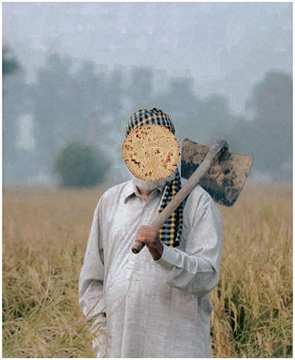Reimagining René Magritte’s The Son of Man in South Punjab, Pakistan, the bowler-hatted man is replaced by a rural farmer in traditional Shalwar Kameez, his face obscured by a floating roti (flatbread). This adaptation shifts the original’s themes of identity and concealment to issues of labor, food insecurity, and economic inequality. The roti symbolizes survival, yet also deprivation—reflecting how those who feed the nation cannot feed themselves. Growing up in South Punjab, I’ve seen farmers endure harsh conditions, now worsened by climate change. This reinterpretation critiques how capitalist systems value the product—food—while erasing the producers. It references Marx’s idea of commodity fetishism, highlighting the disconnect between urban consumers and the labor behind their food. Culturally grounded in rural South Punjab, the piece portrays the farmer as faceless and forgotten, amid a background of environmental degradation and migration-driven village decline. The hovering roti mirrors Magritte’s apple in its surrealism but layers meaning around nourishment and neglect. Ultimately, this reimagining honors Magritte’s exploration of visibility and identity, while addressing contemporary issues of exploitation, environmental collapse, and the invisibility of rural laborers who remain essential yet unseen.