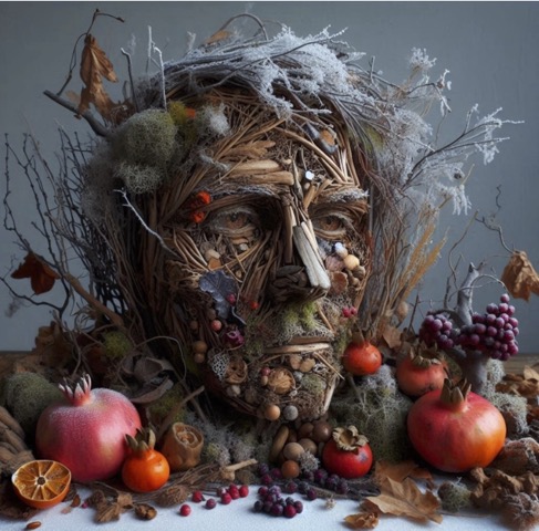 If I were to reimagine Arcimboldo’s Four Seasons, I’d choose Winter (1563), I’d transform it into a sculptural installation using real dried plant materials—bark, moss, branches—shaped into a face emerging from a tangled mass. Resin ice droplets would hang from the branches, catching light like frozen dew, while soft, shifting lights would cast shadows to make the figure feel alive. Unlike the original static portrait, this piece would be immersive and walkable, letting viewers engage from all sides. To add a personal layer, parts of the bark would peel back to reveal delicate floral imprints—hinting at life hidden beneath the surface. Winter fruits like pomegranates, persimmons, and berries would be integrated into the sculpture. Their rich reds and oranges would contrast with the brittle bark, some split open or crystallized, symbolizing both decay and renewal. For me, winter isn’t just an end—it’s a quiet in-between, where something is always waiting to bloom.